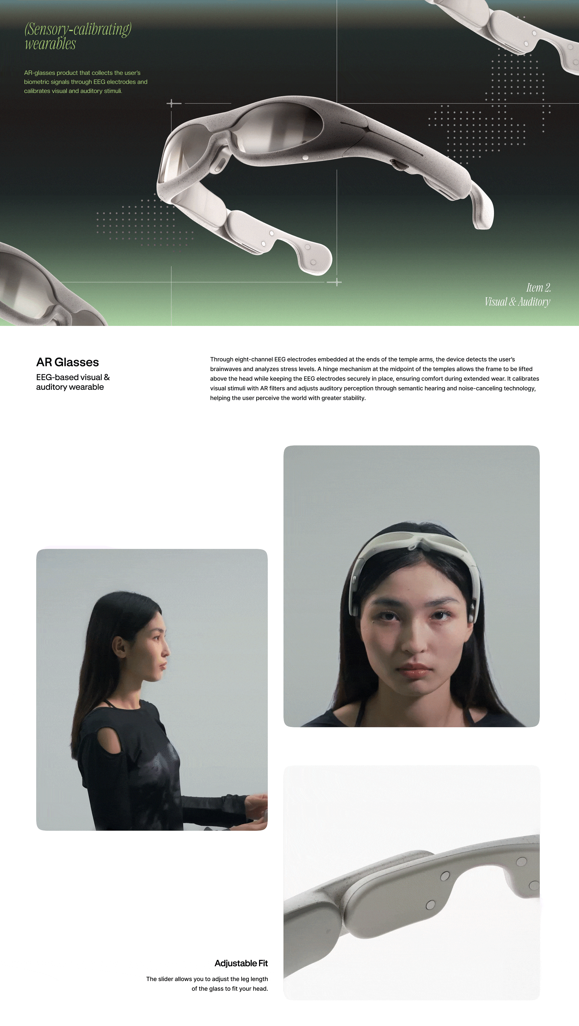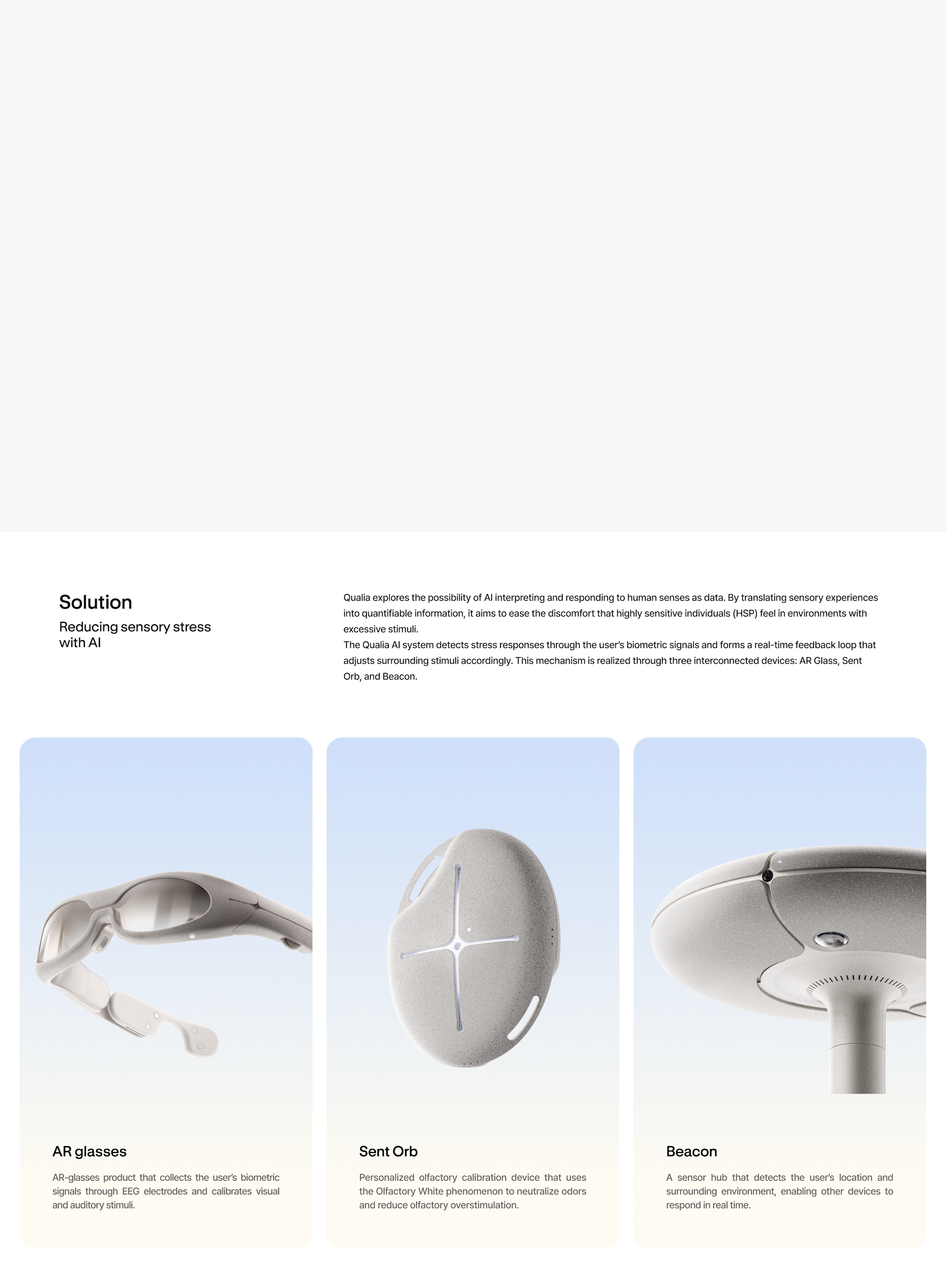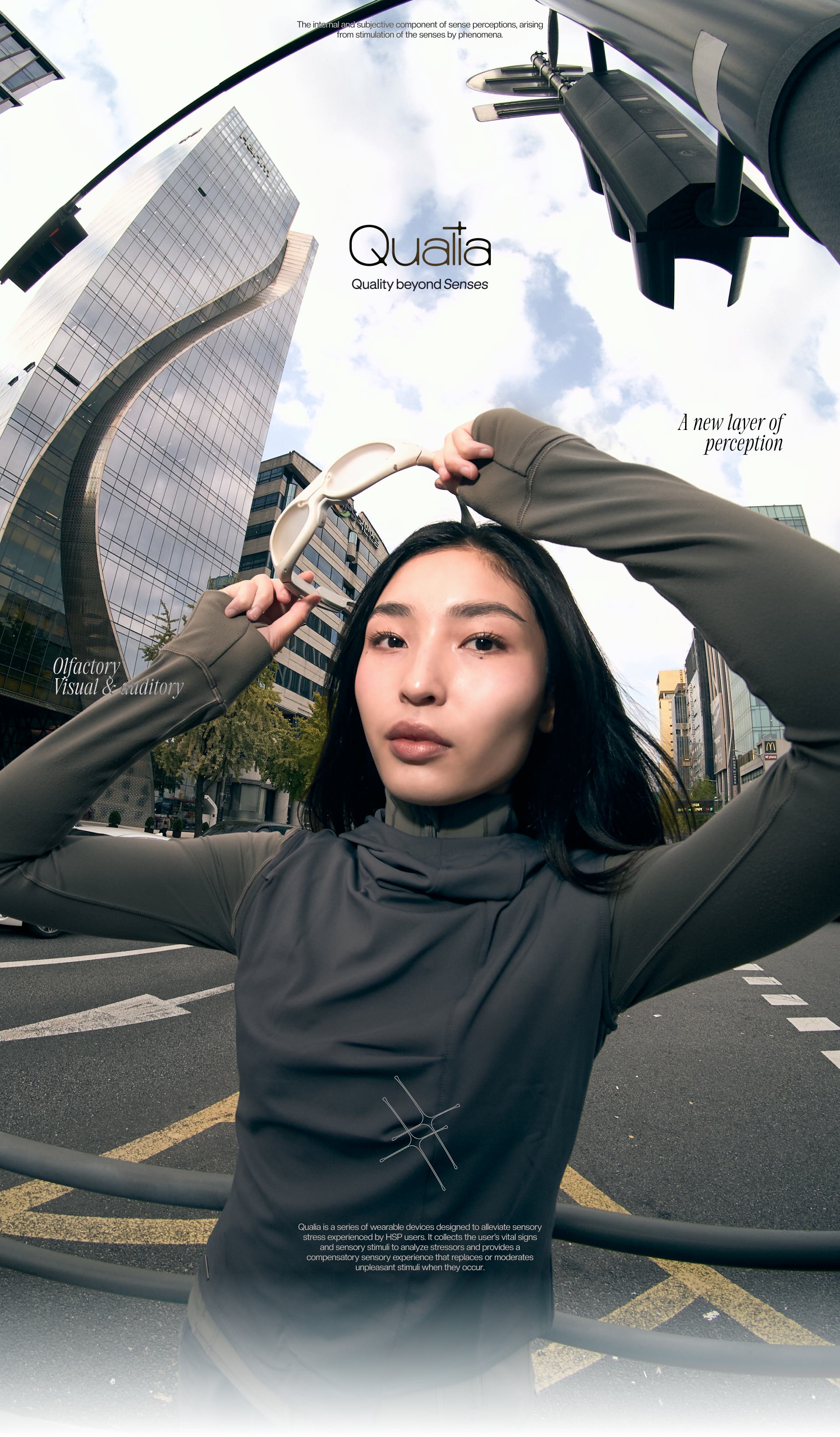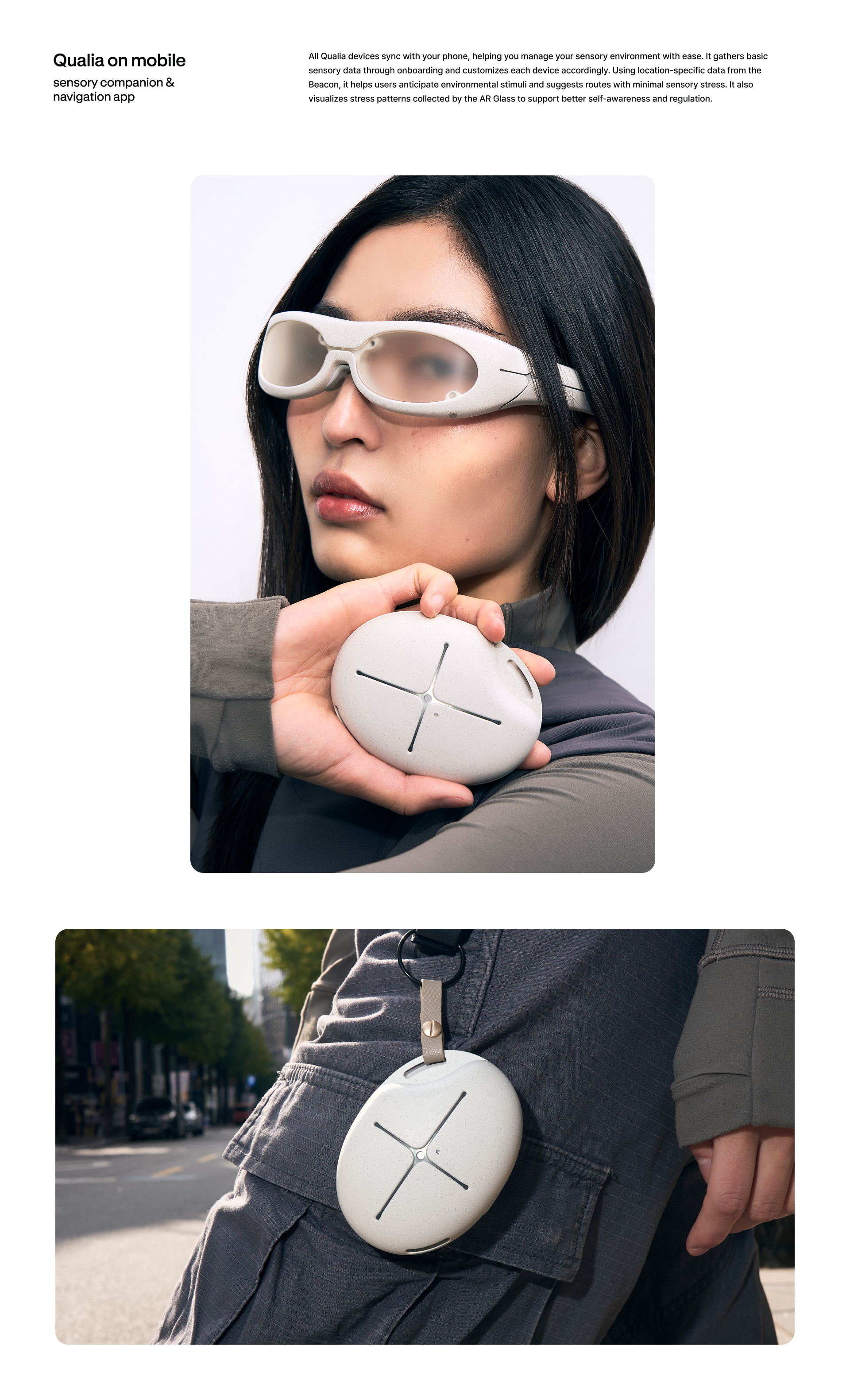 Qualia is a wearable sensory calibration device designed for Highly Sensitive People (HSP) to use outdoors. It analyzes sensory stimuli from the user’s biometric signals and surrounding environment in real time, correcting visual, auditory, and olfactory inputs that may trigger stress. The Qualia AI learns each user’s unique response patterns to help maintain emotional balance. Qualia proposes a new lifestyle that enables individuals to sustain inner composure and sensory harmony even in dynamic external environments.