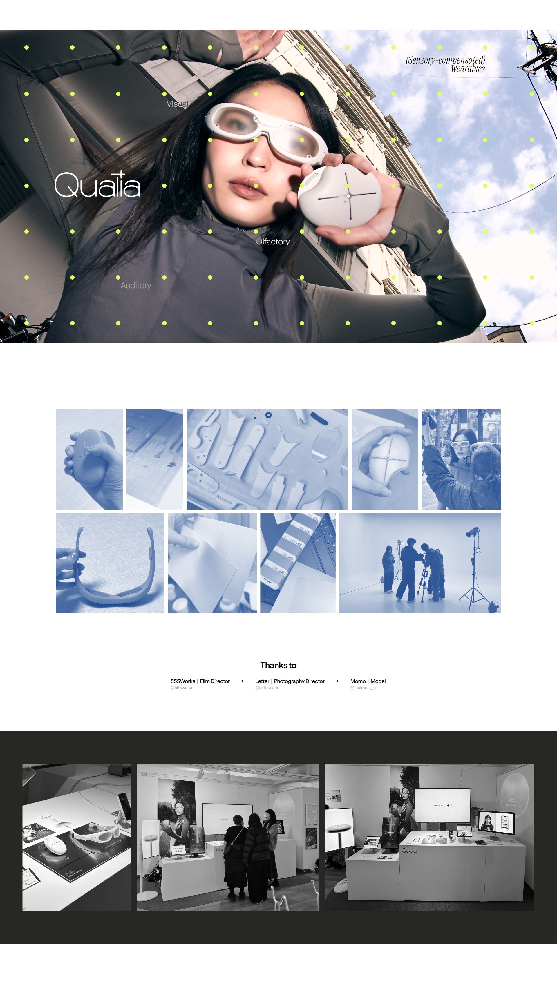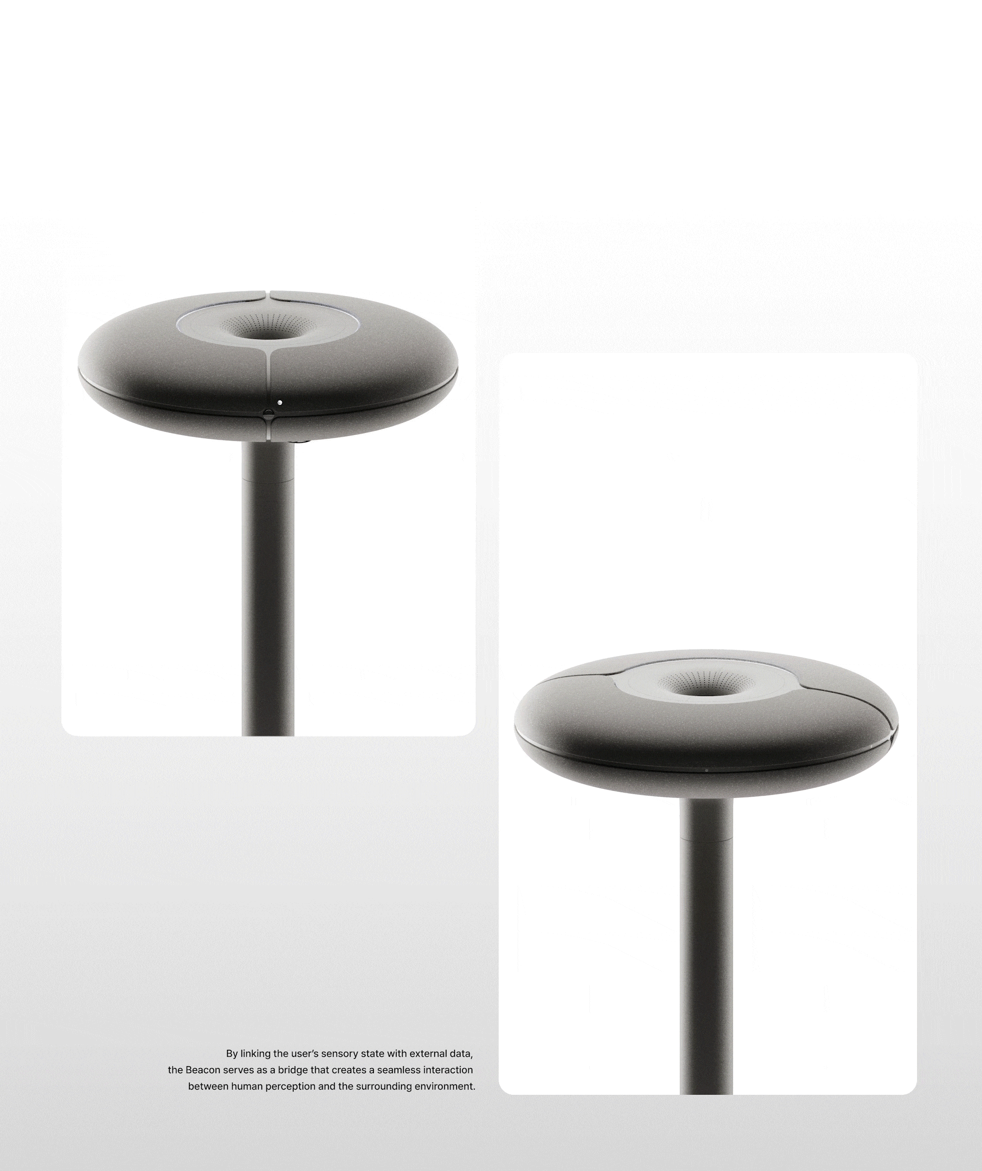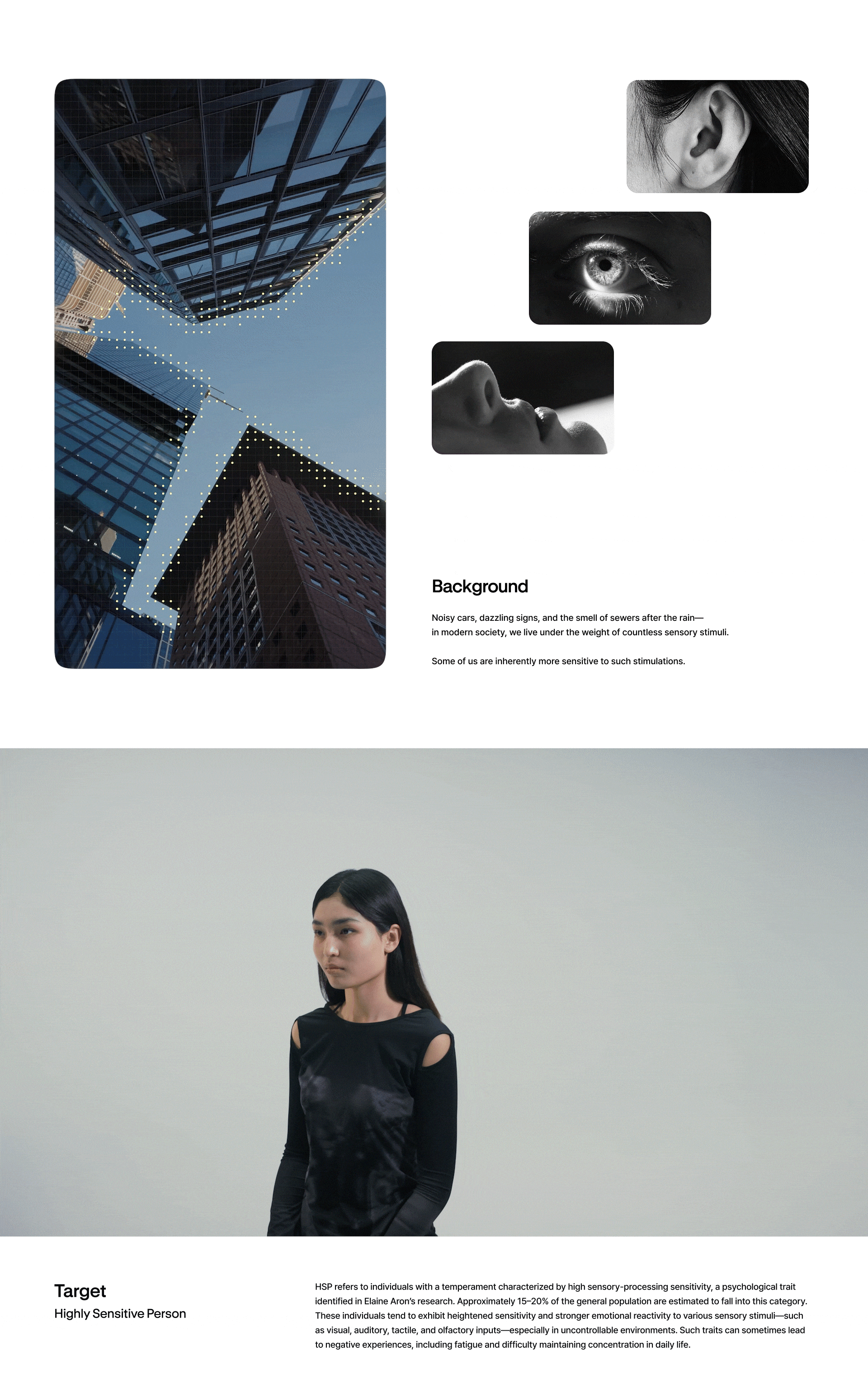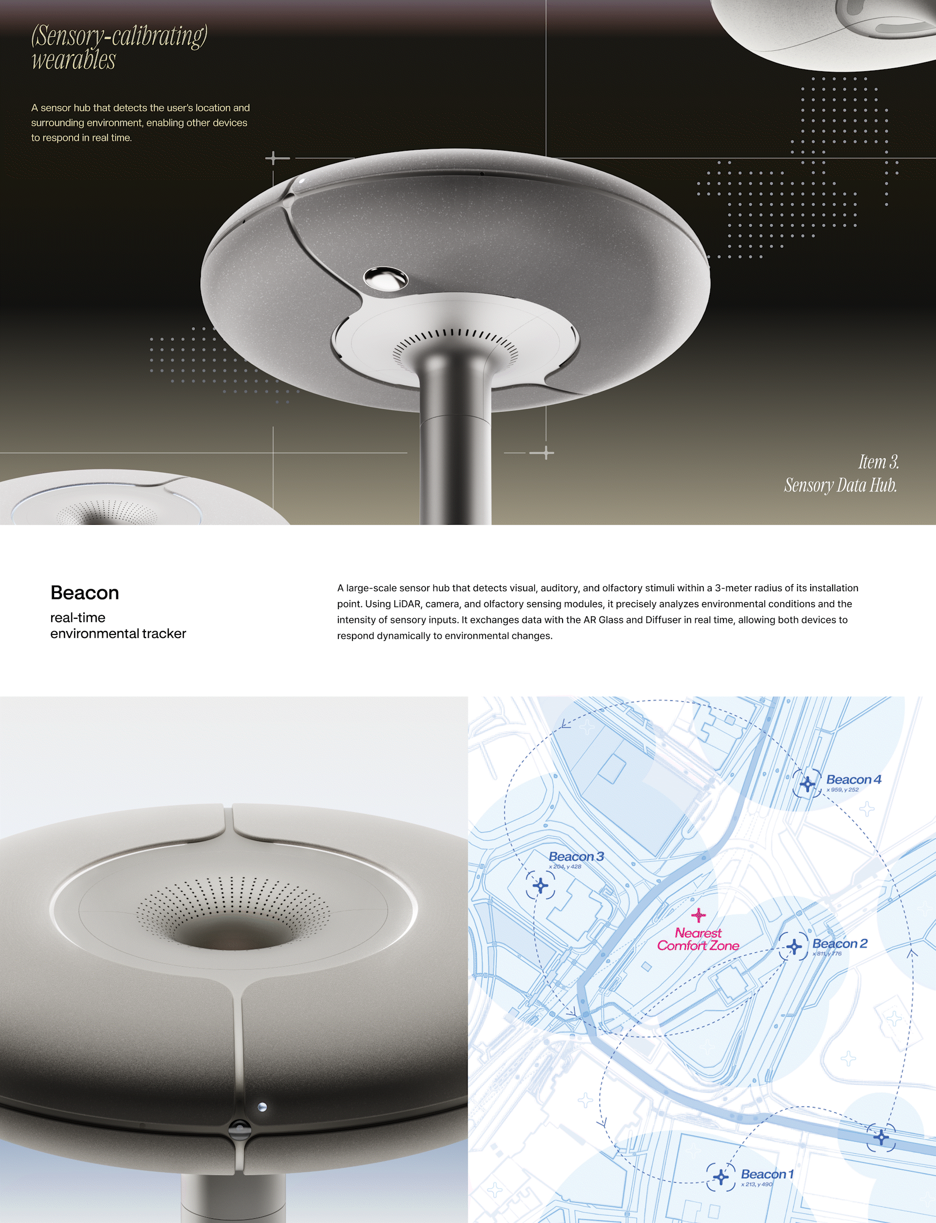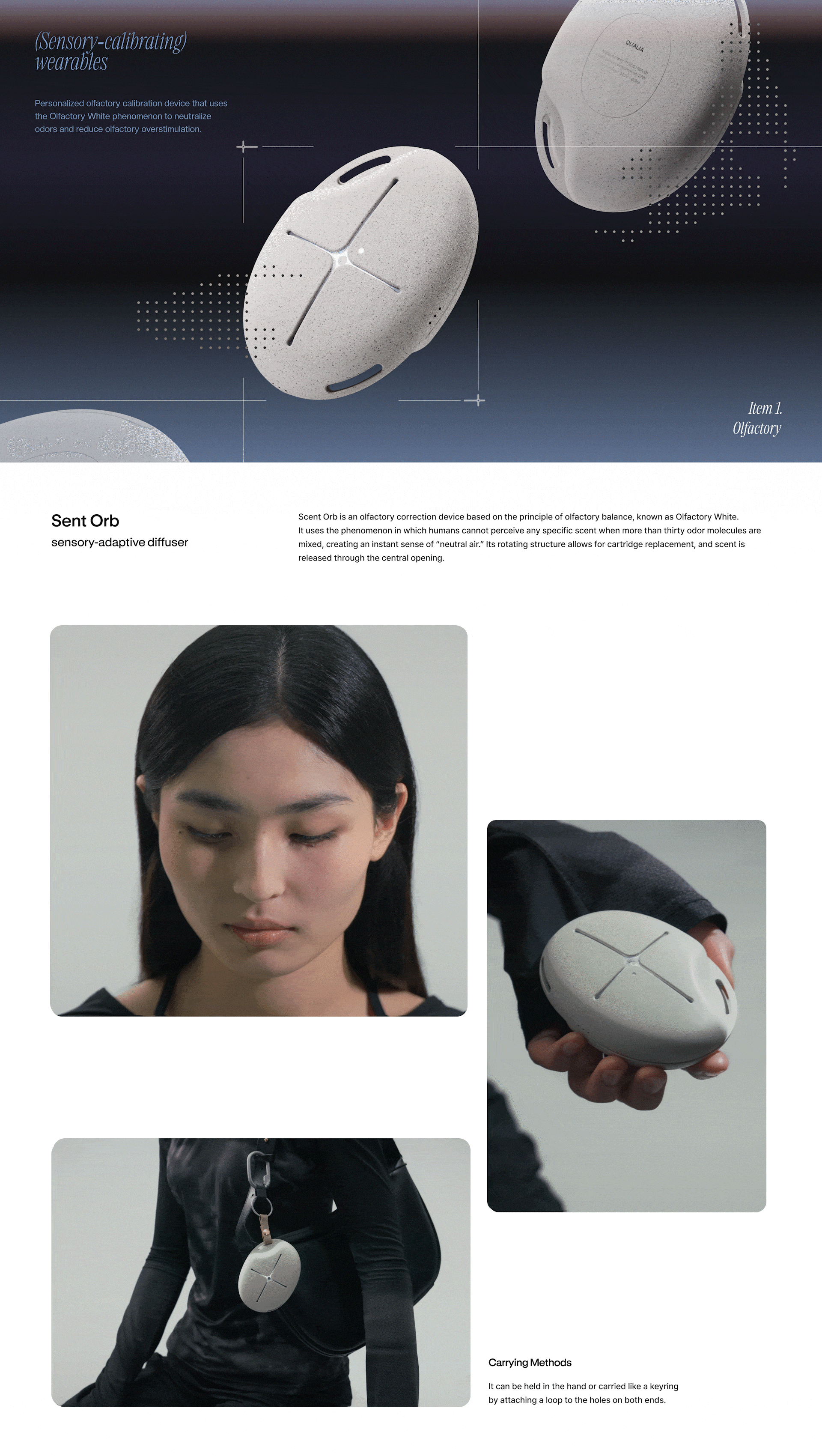 Qualia is a wearable sensory calibration device designed for Highly Sensitive People (HSP) to use outdoors. It analyzes sensory stimuli from the user’s biometric signals and surrounding environment in real time, correcting visual, auditory, and olfactory inputs that may trigger stress. The Qualia AI learns each user’s unique response patterns to help maintain emotional balance. Qualia proposes a new lifestyle that enables individuals to sustain inner composure and sensory harmony even in dynamic external environments.