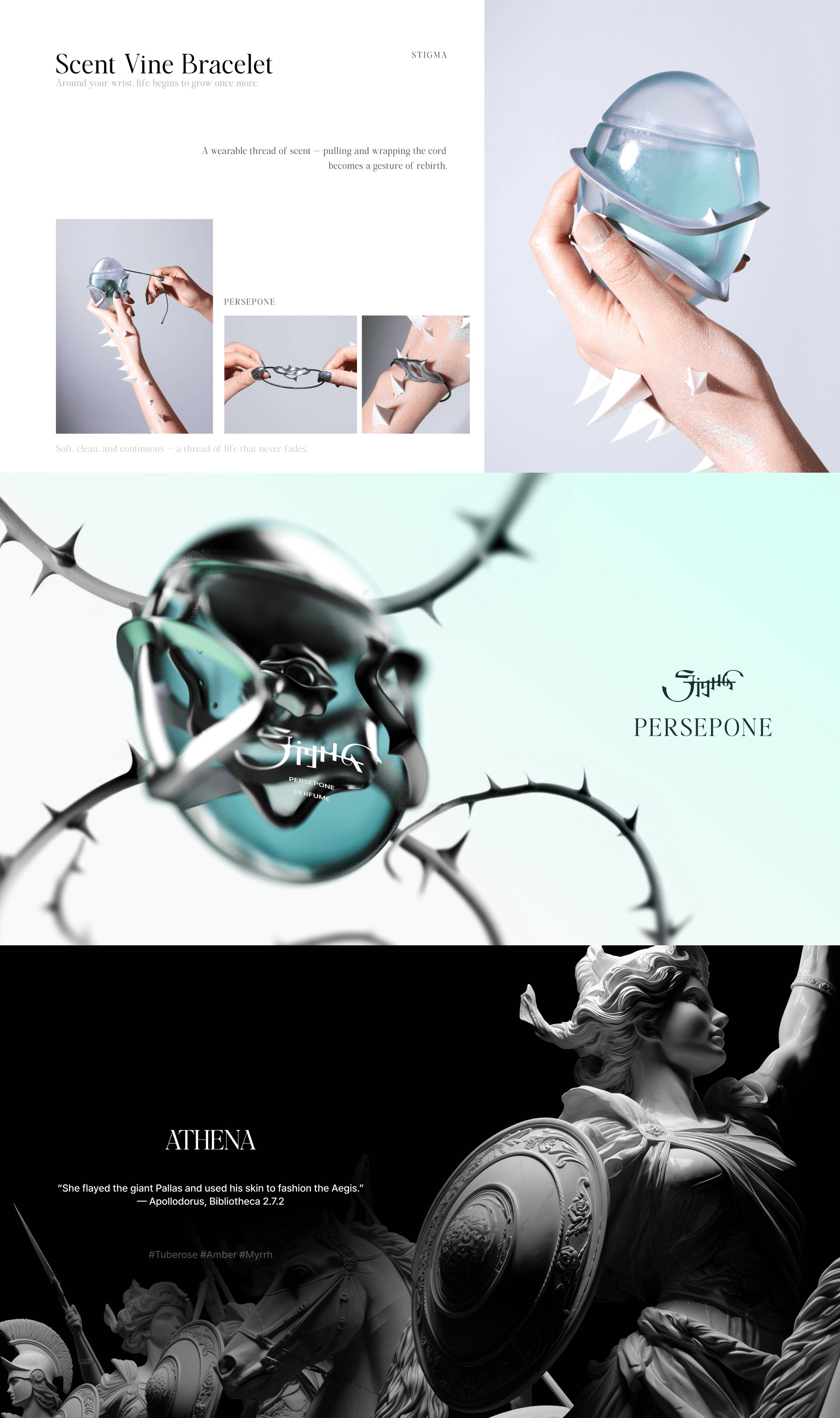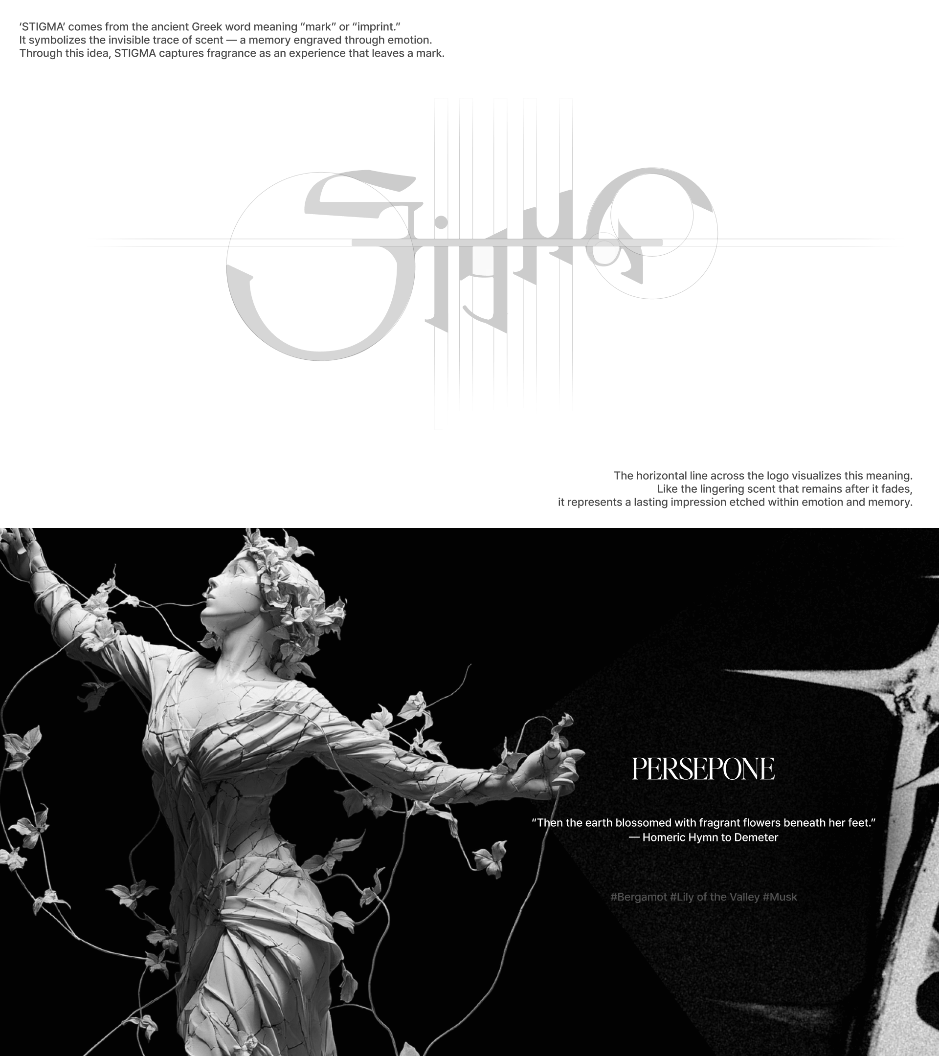 STIGMA reimagines scent as an experience rather than a product. Inspired by Greek mythology, it renews the way fragrance is experienced—transforming it into a medium of emotion and narrative, where each use becomes a personal act of storytelling. Through this approach, STIGMA redefines how scent is felt, turning the act of wearing fragrance into a contemporary myth of its own.