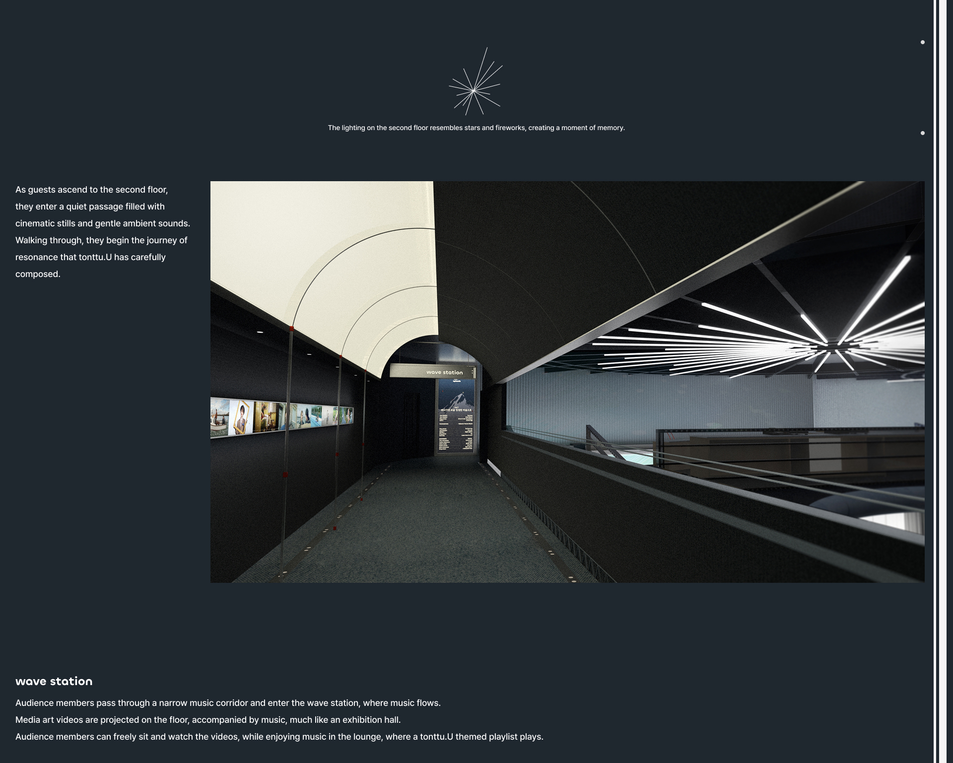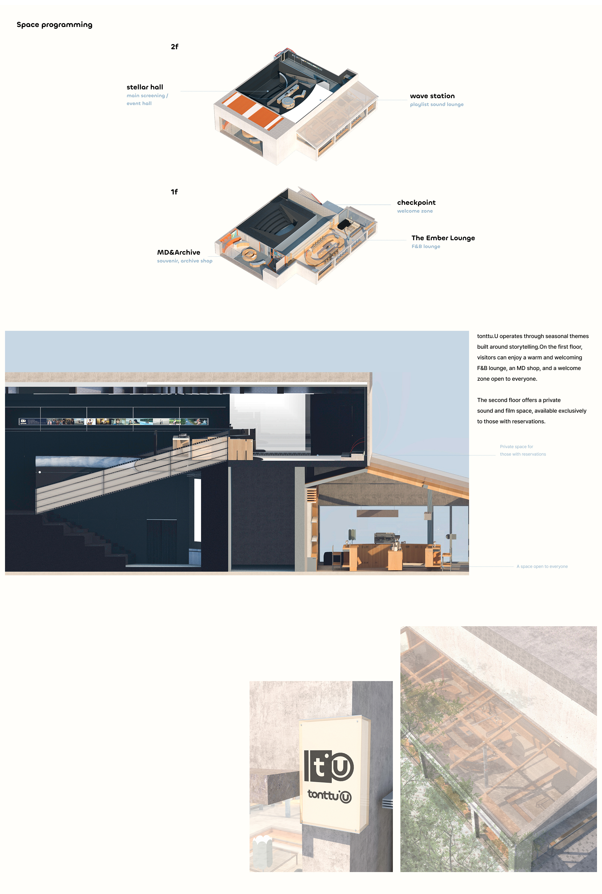 tonttu.U captures delicate moments through sound and film, curating them into a seamless flow of audiovisual experience. Each season unfolds around a narrative theme, where music and cinema quietly resonate with the audience. The spatial world begins in a snow-covered mountain, a journey in search of light. Those who gather at this basecamp share warmth and stories before setting off again, and that sentiment takes form as a space within the city. The offline space, tonttu.U; episode, offers a lounge of rest and warmth, a sound & screening zone for deeper resonance, and an archiving shop that concludes the journey. Here, visitors naturally dwell within the unfolding narrative, carrying its quiet echo into their everyday lives as tonttu.U expands across both physical and digital worlds.