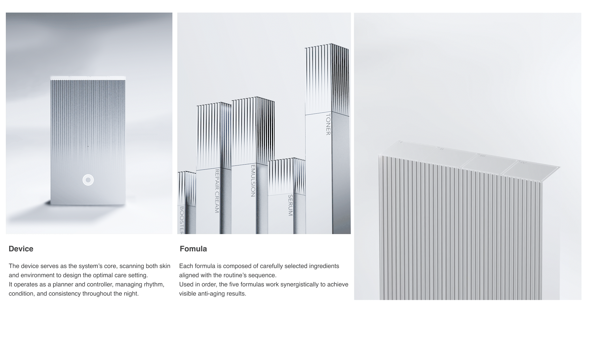 From evening to morning, its device and five formulas harmonize with the skin’s natural rhythm of renewal.