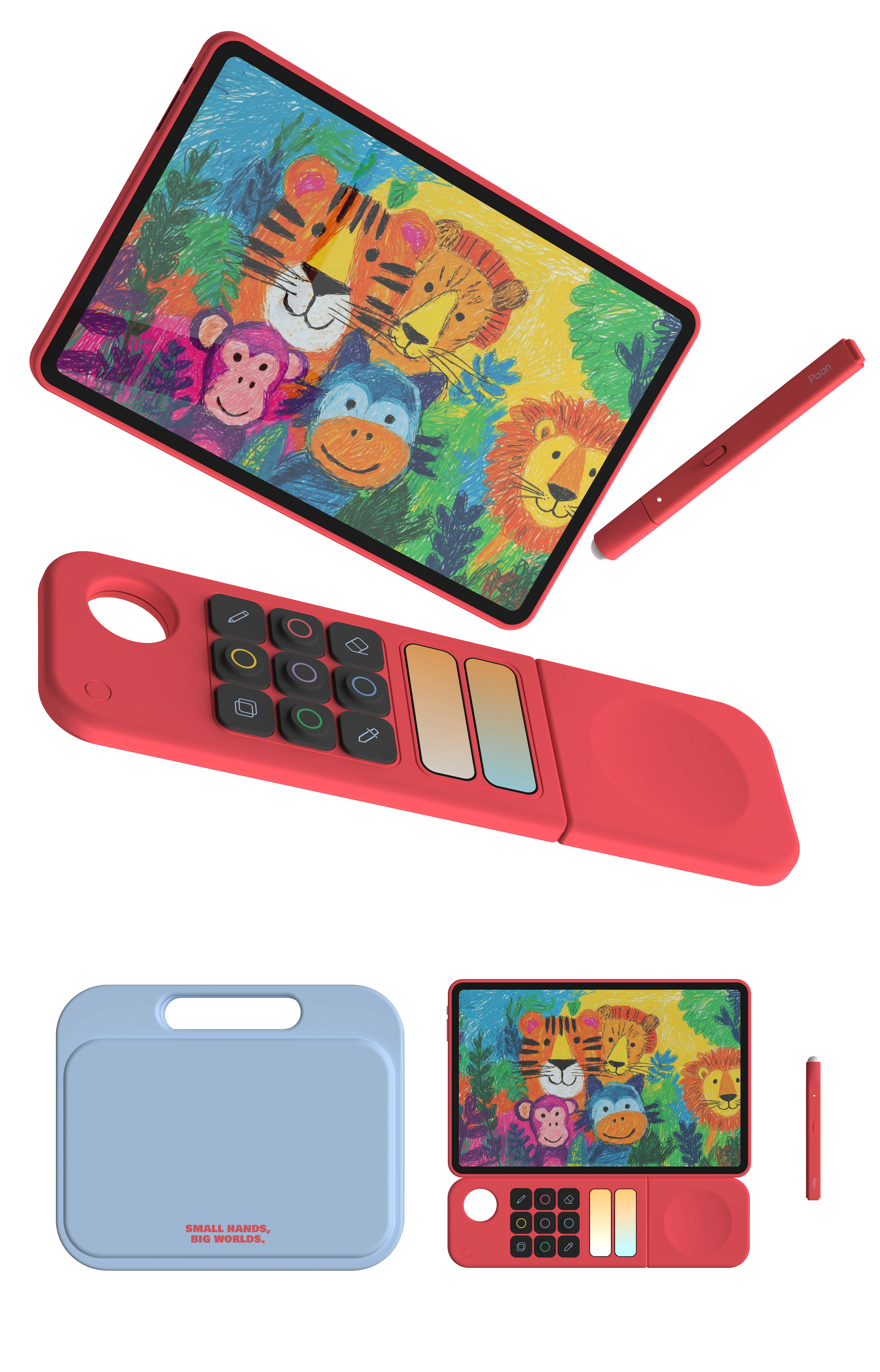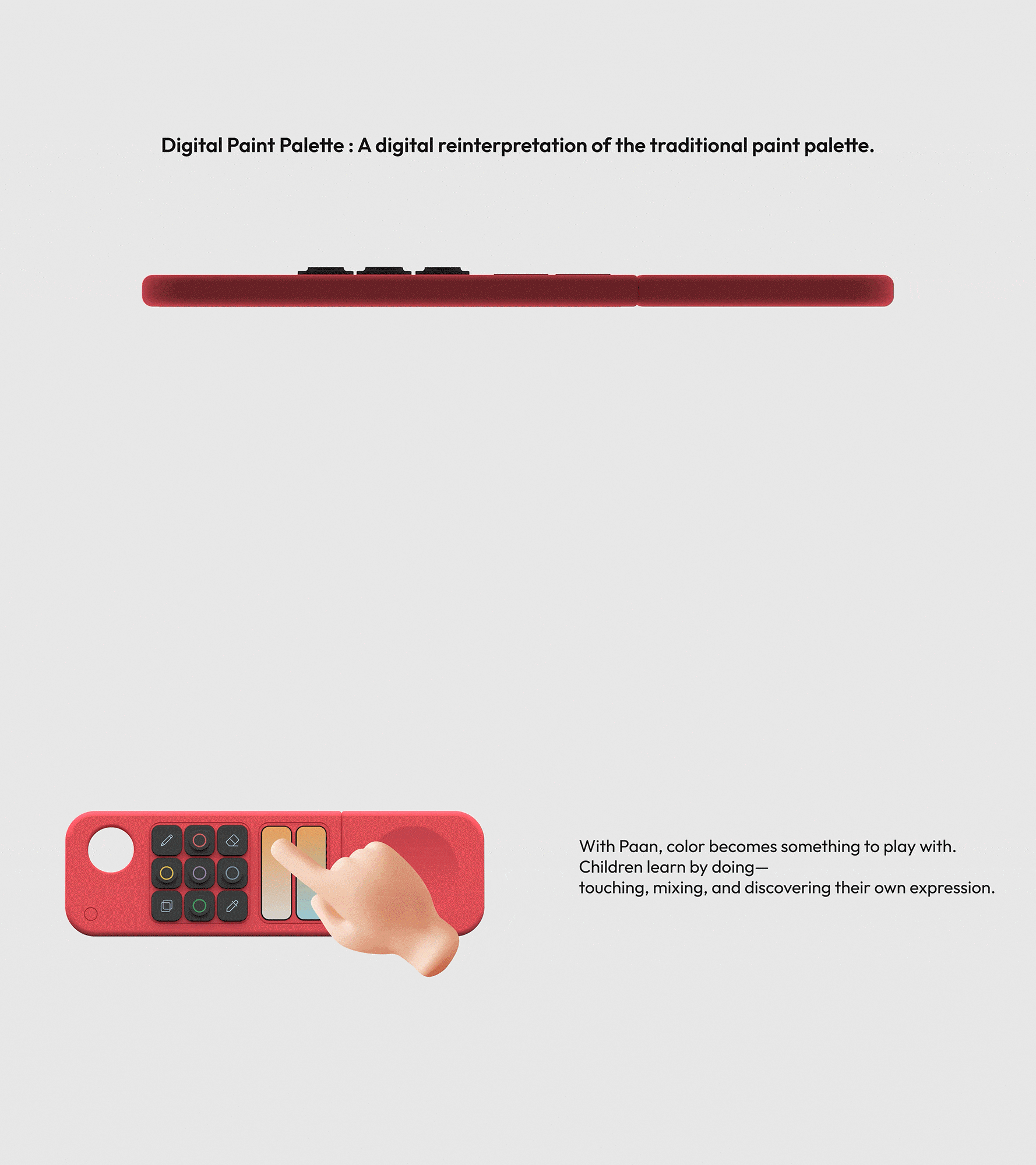 Paan is a portable creative interface that helps children keep their flow of imagination anywhere. Designed for a generation fluent in digital media, it brings back the tactile experience of drawing and exploring color beyond the screen. By reinterpreting the paint palette in digital form, children can choose, adjust, and mix colors to create their own tones. At home, in a café, or on the move, Paan supports uninterrupted creative play— a tool for big worlds in small hands.