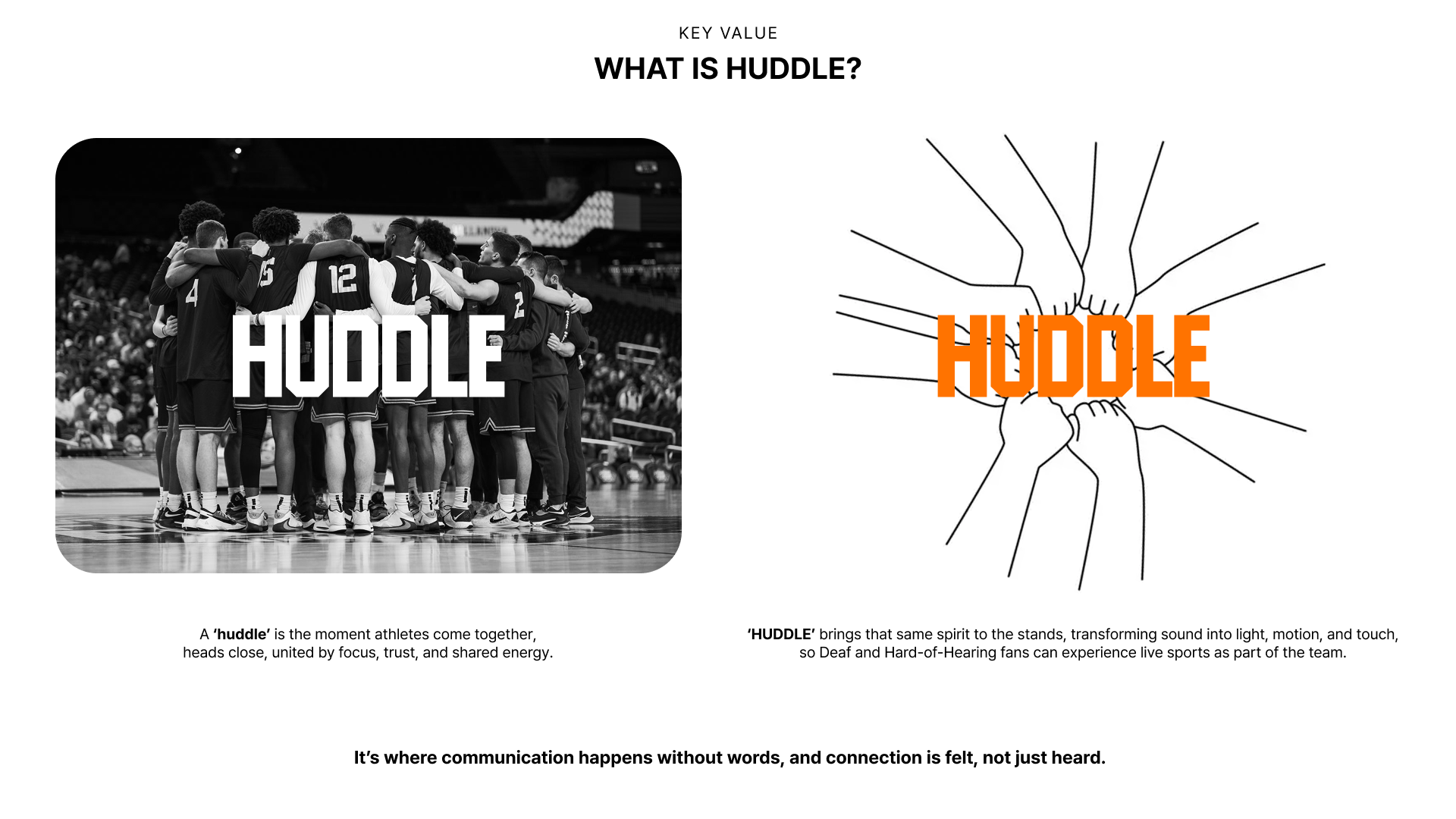 huddle is an AR-based inclusive sports platform that transforms live games into shared multisensory experiences for Deaf and Hard-of-Hearing fans. Through AR glasses, every whistle, chant, and cheer becomes visible and touchable, turning crowd energy into light and motion. By syncing emotional rhythm and enabling gesture based communication, Huddle lets every fan feel connected, included, and part of the game.