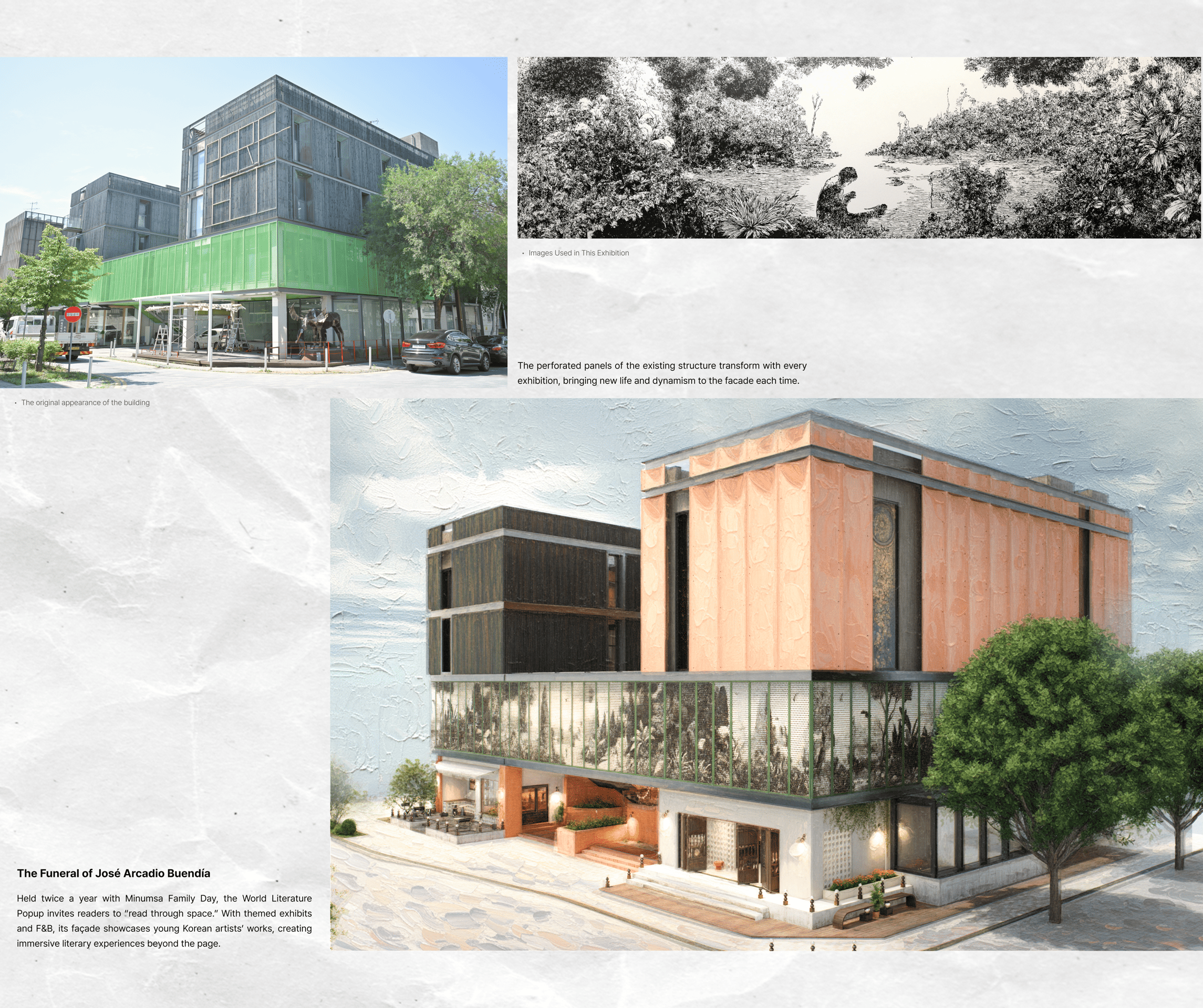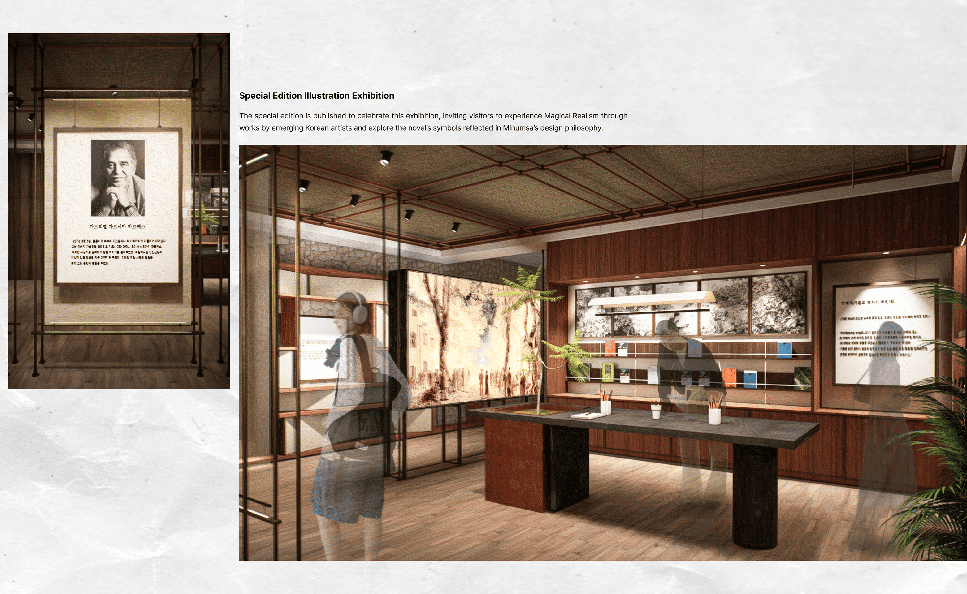 ‘From Page to Space: Minumsa x Cien Años de Soledad’ interprets literary narratives as spatial experiences. Inspired by Minumsa’s World Literature Collection, this project transforms reading into immersive experience for modern readers who find classics difficult. Each year, one title is reimagined through symbolic and poetic spatial storytelling, accompanied by F&B and cultural programs. Visitors read literature through space, experience narratives physically, and expand their literary imagination.
