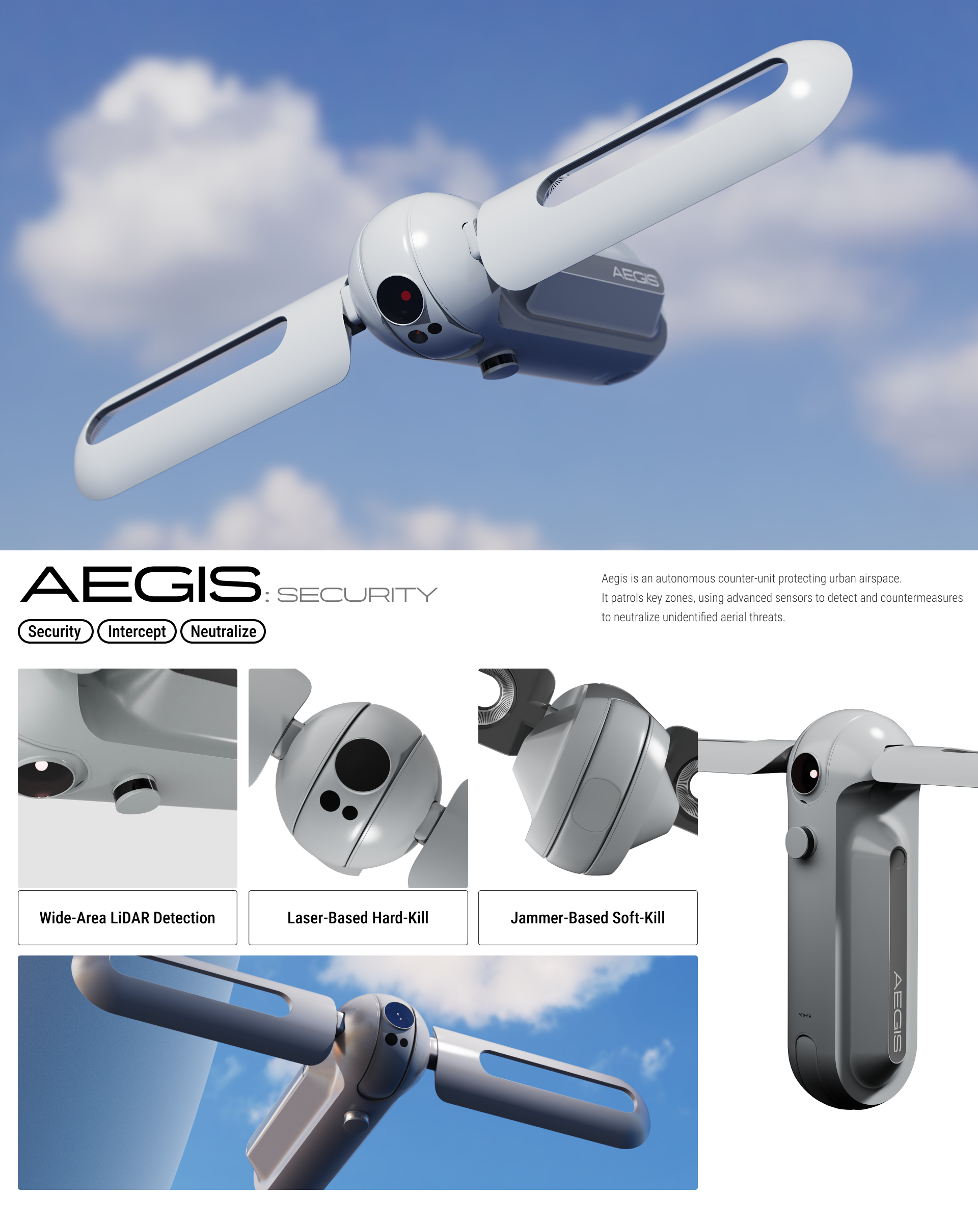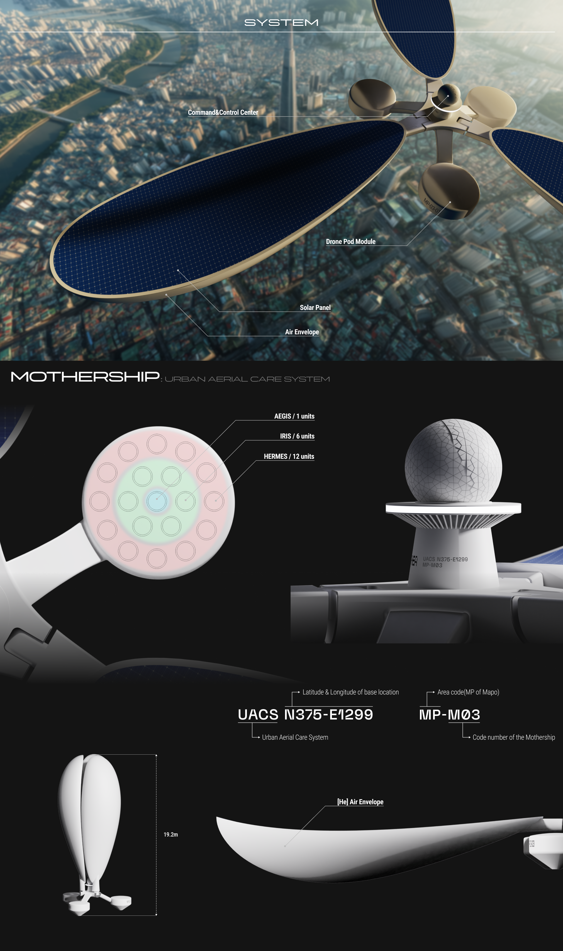 Project 'AETHER' is a next-generation Urban Aerial Care System, consisting of three types of drone units and their mothership. It is a concept project that floats at low speeds above the city, supporting the safety and prosperity of its citizens.