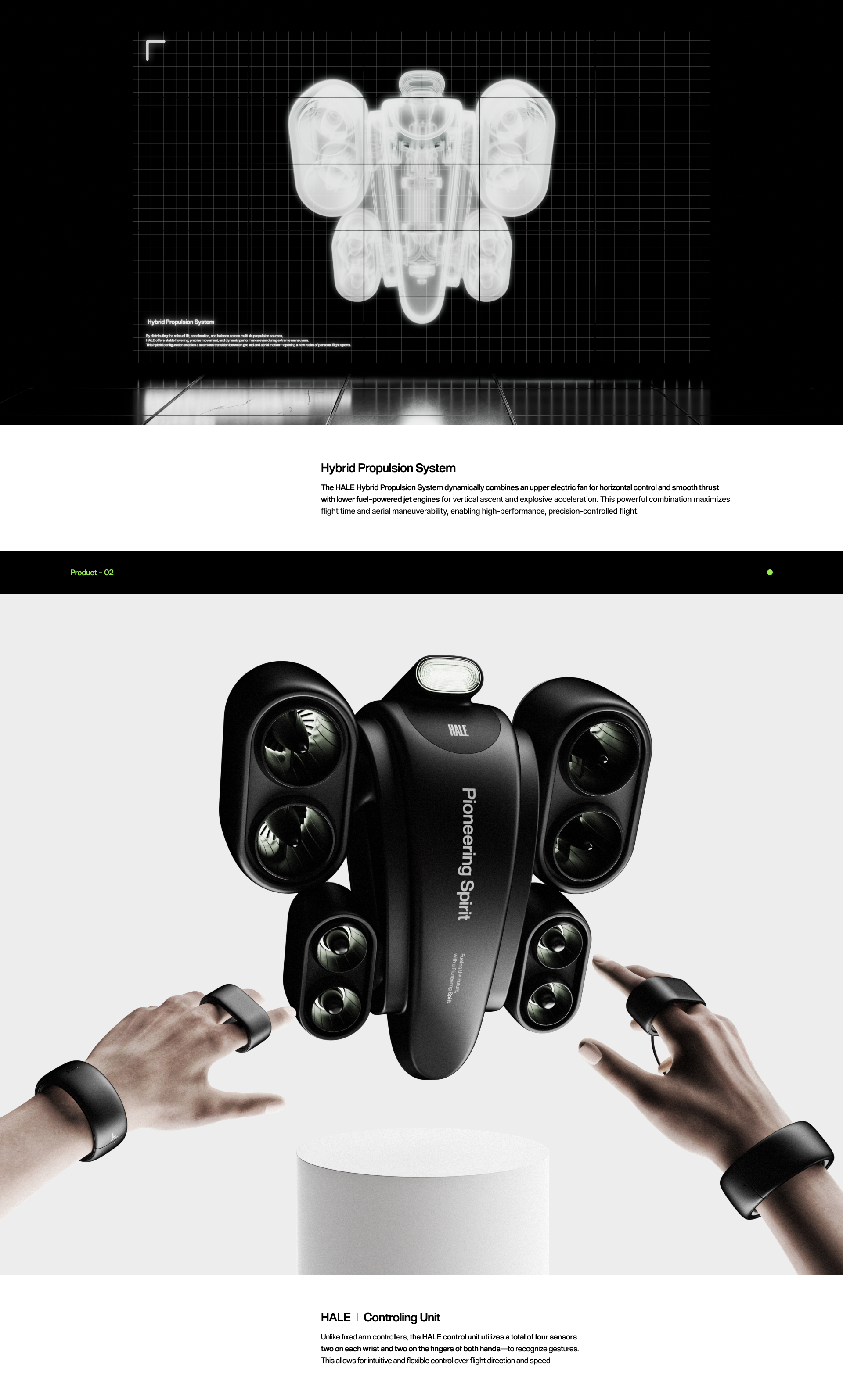 Powered by a hybrid propulsion system, it enables a seamless transition between ground and air, delivering an entirely new form of high-intensity sport. Balancing speed, stability, and precision thrust control, HALE empowers pilots to fly freely and push their physical and mental limits in the air.