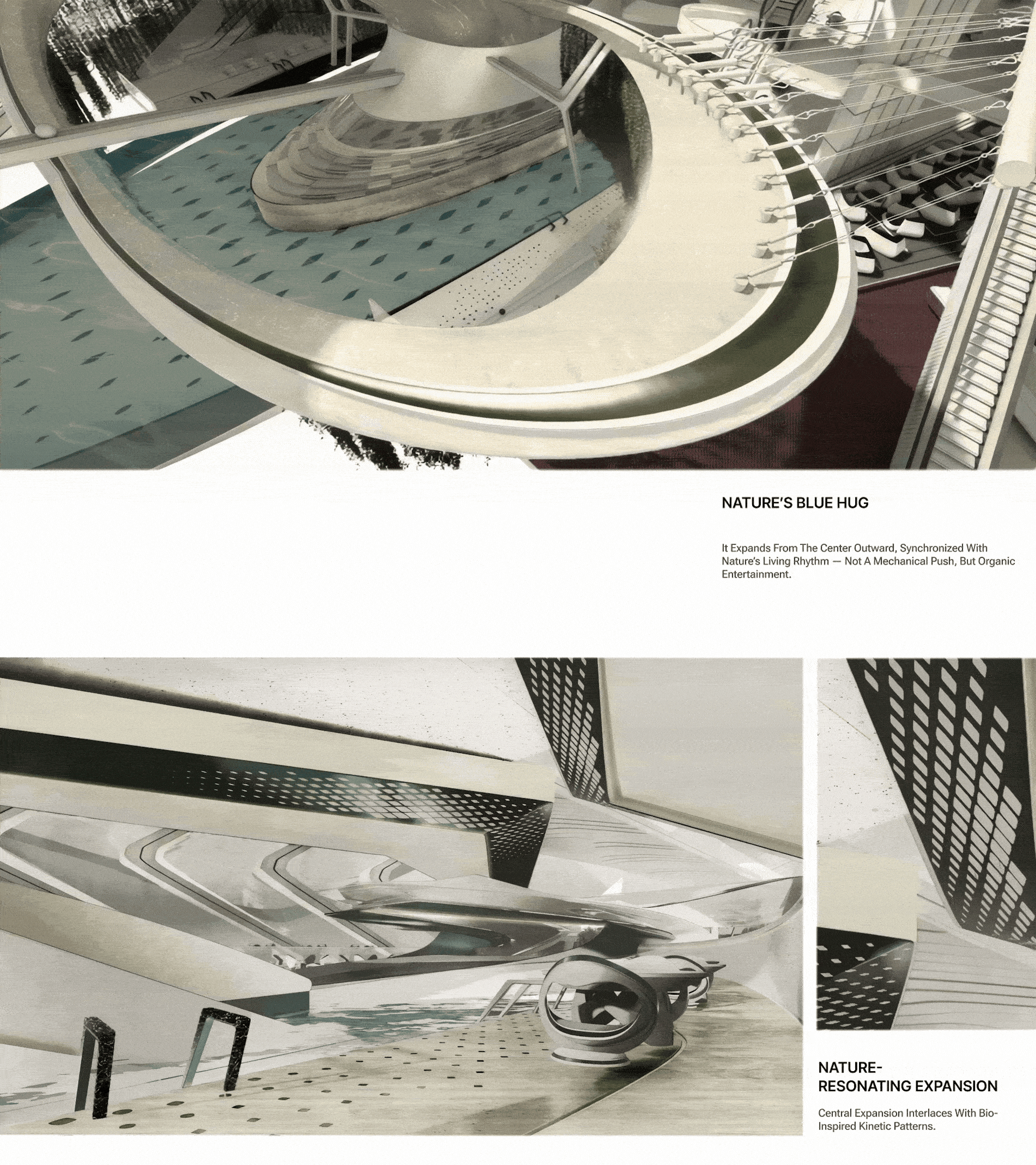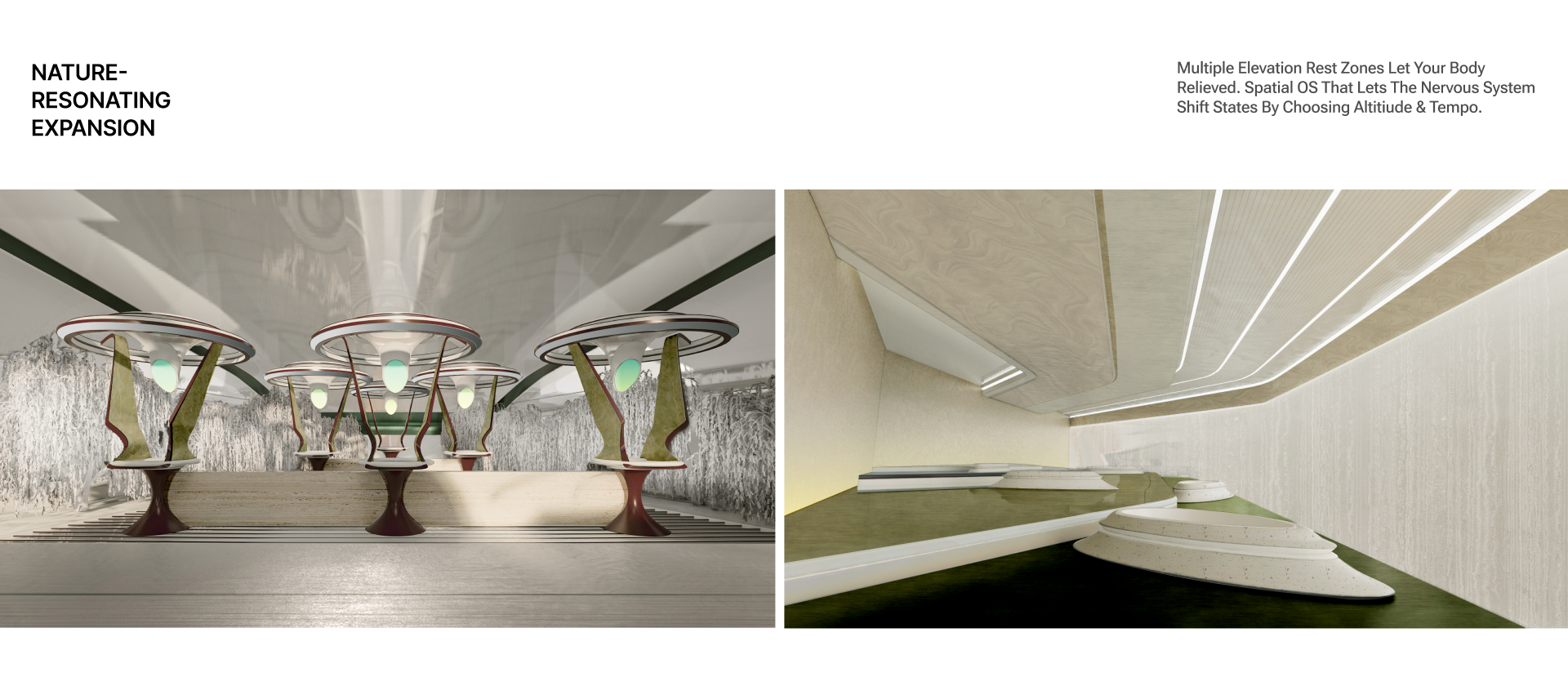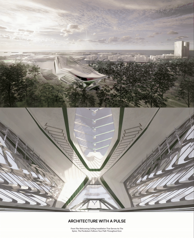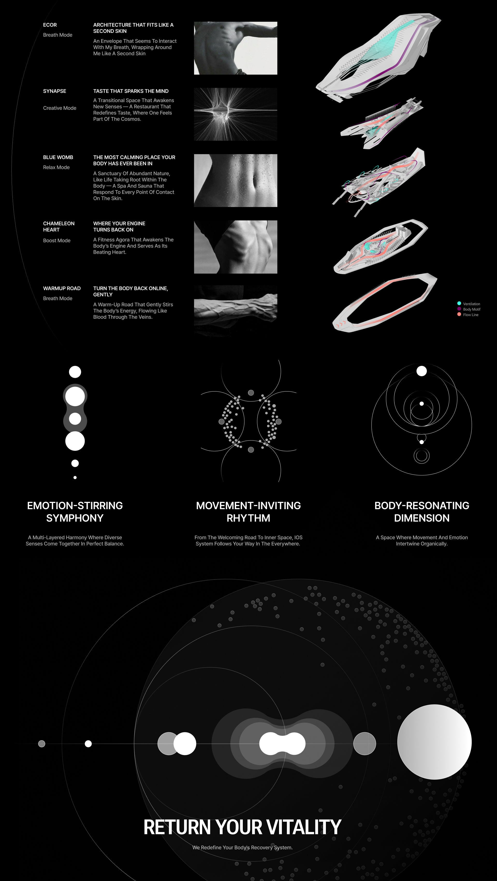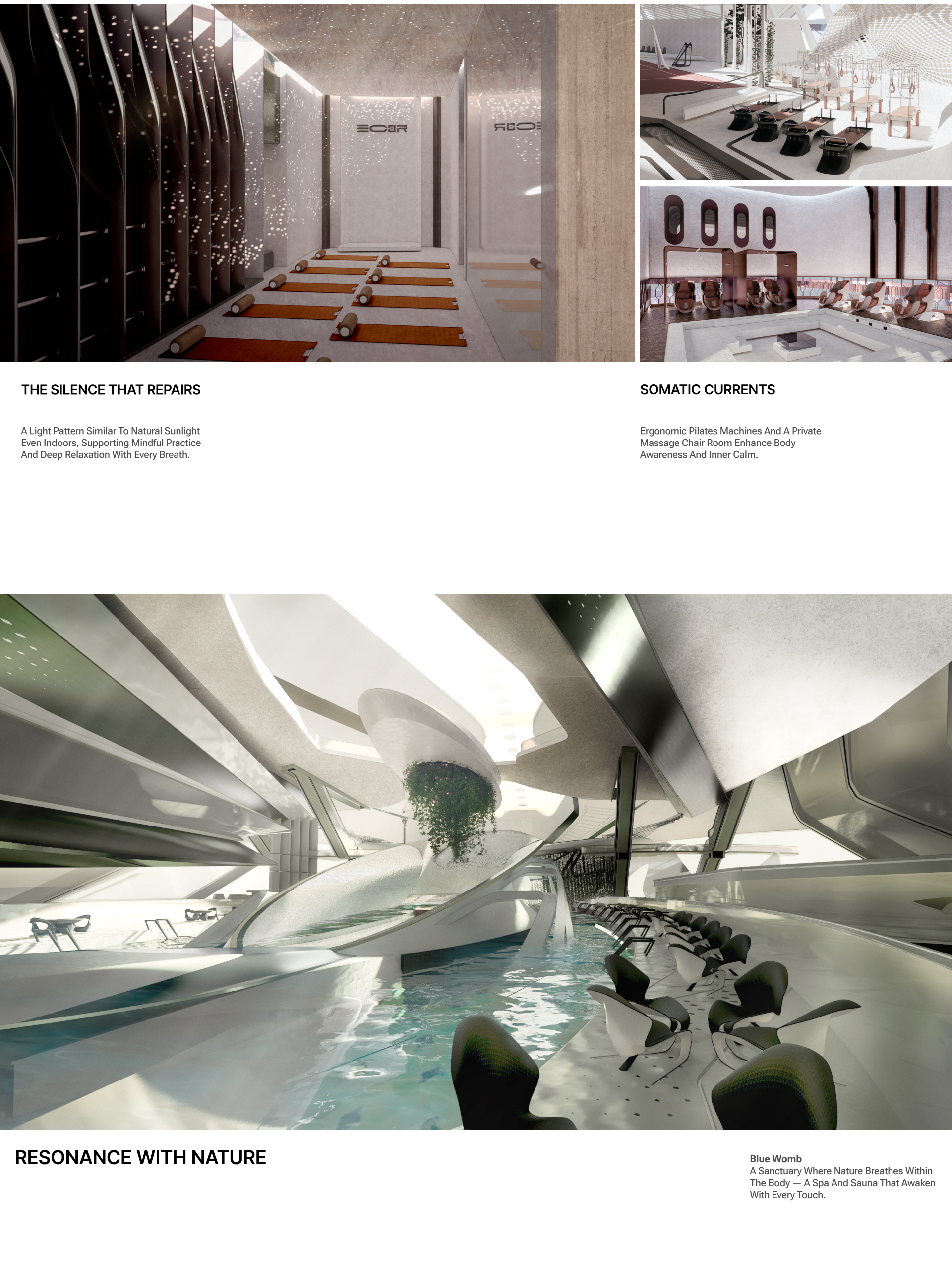 Unlike cold, inert structures, ECOR is living architecture that breathes, senses, and responds—a next-generation wellness platform reflecting human rhythm and breath, where body, technology, and art converge. Designed as a single body, it reacts to movement, light, and temperature like a living organism. Its interior spaces—Core Heart, Blue Womb, and Synapse—awaken bio-rhythms, evoke primordial calm, and connect light and taste, creating a new stage for the living body.